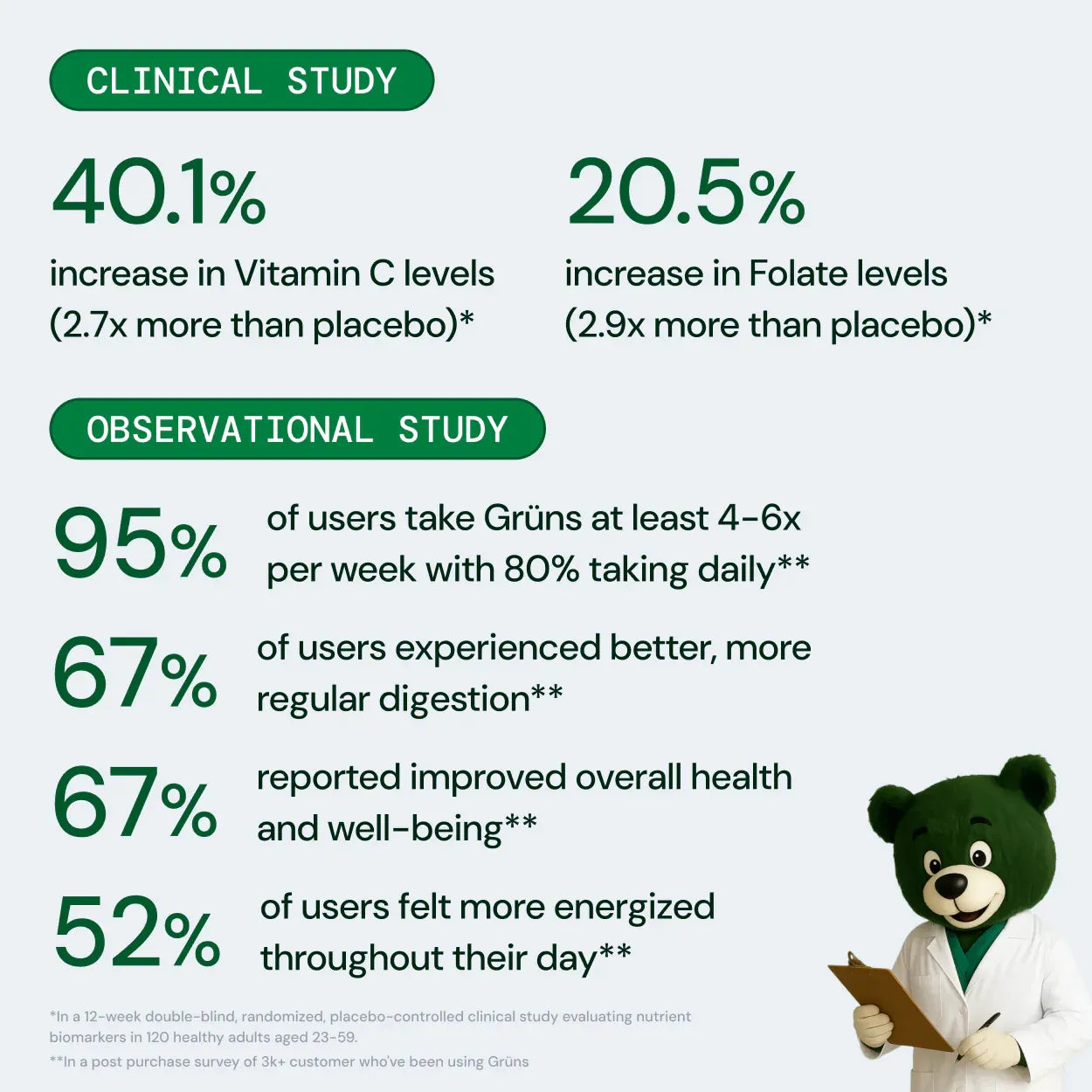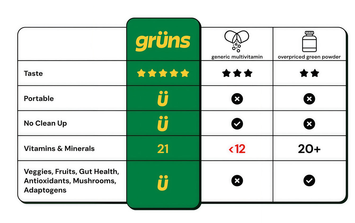 I've tried a few green powders over the years. The issue has never been nutritive content. It's always been an issue of consistency like many things. Gruns has been the one thing I've been able to stick to because they are so easy to consume and taste wonderful (just like gummy bears).
