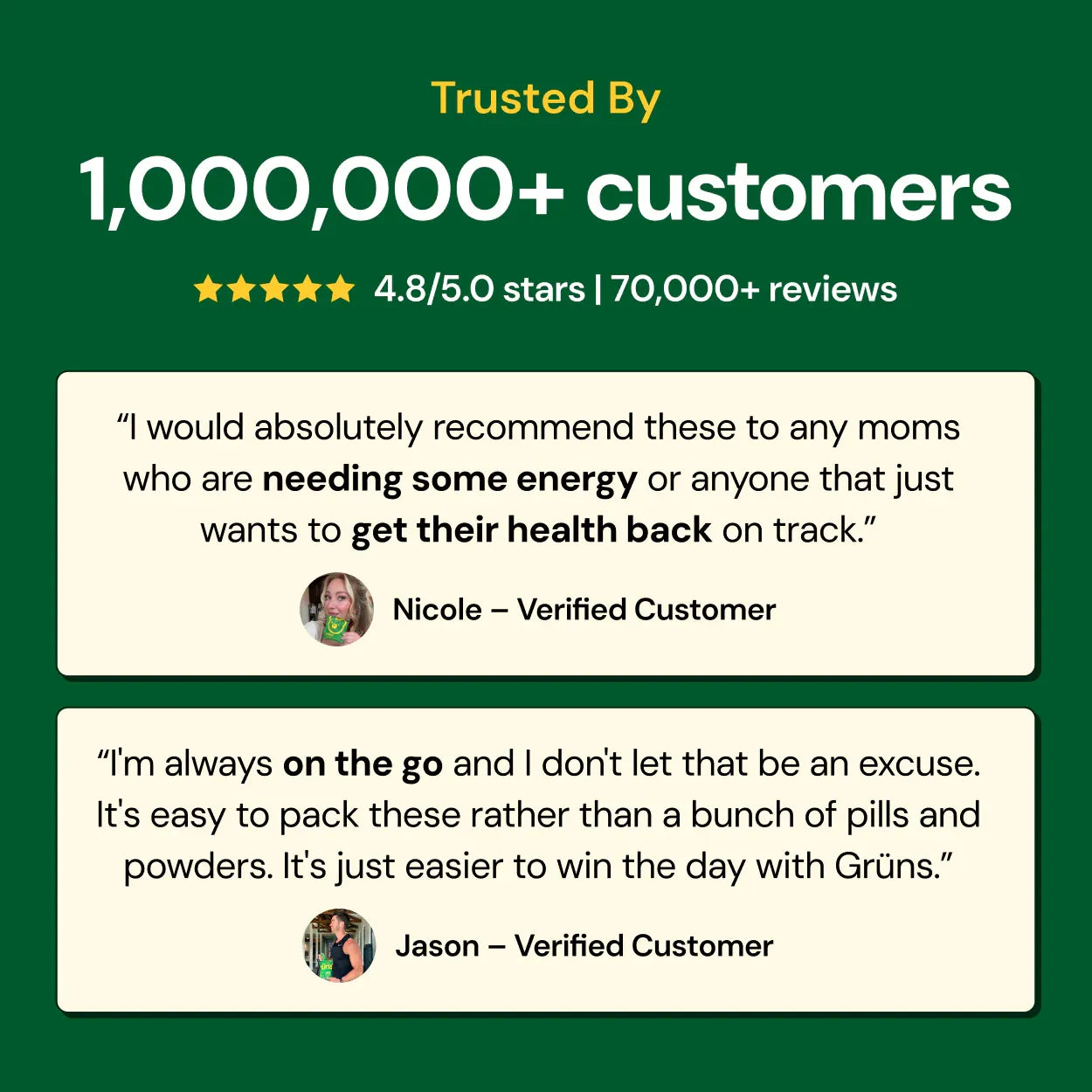 "As a former pro athlete, I've always looked for ways to stay sharp, feel my best,and fuel my body without overcomplicating it. Gruns uses clean ingredients that actually deliver, and I love that it makes better health accessible to everyone, whether you're training at the highest level or just trying to make good choices every day."